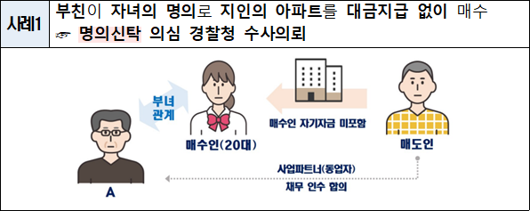 또 다른 적발 사례를 보면 20대인 A씨는 아버지의 지인이 보유한 서울 소재 아파트를 약 11억원에 거래하는 계약을 체결했다. 하지만 이 거래에서 대금지급 없이 매도인의 채무를 인수하는 조건으로 소유권을 A씨에게 이전됐다. 문제는 A씨는 인수받은 채무의 상환 능력이 없었다는 것이다. 국토부는 이 거래를 명의신탁 의심 사례로 분류해 경찰청에 수사 의뢰했다.