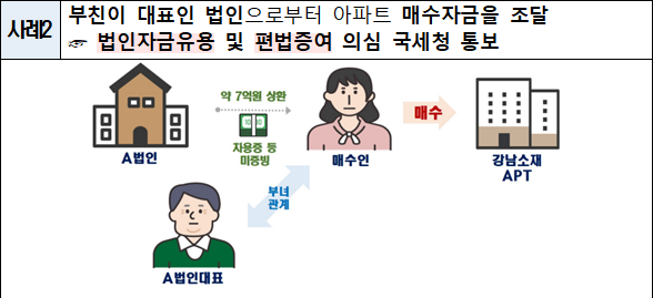 적발 사례 가운데 A법인 대표는 서울 강남 소재 아파트를 29억원에 사들였다. 법인 대표A씨는 이 금액 가운데 약 7억원을 법인을 통해 조달한 것으로 나타났다. 국토부는 법인자금유용과 편법증여가 의심된다고 판단, 국세청에 통보할 계획이다.