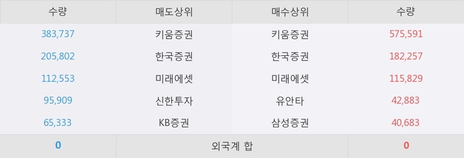 아직까지 외국계 증권사 창구를 통한 매매는 발생하지 않고 있다. 그리고 이 시간 한국증권이 매수창구상위에 올라있는 종목은 이 종목 이외에도 삼진, NH올원리츠 등이 있다.