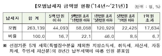 2022년 모범납세자 현황을 보면 1천만원 이하를 납부한 납세자는 10만2151명(38.9%)으로 가장 많은 수를 차지한다. 1억원 초과 납세자도 1만7634명(6.7%)이나 된다.