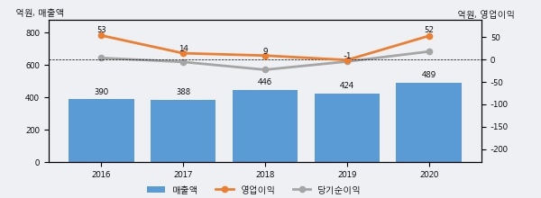 최근 실적을 살펴보면 2020년 매출액이 최근 5년 중 가장 높은 실적을 기록했음을 알 수 있다. 이전 최고 실적이었던 2018년 보다도 9.7%(43억 4천만원) 늘어난 것으로 나타났다.