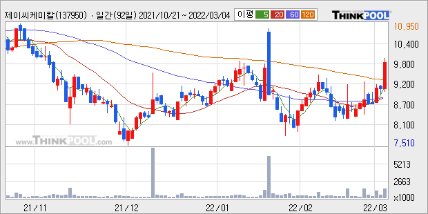 제이씨케미칼은 2020년 매출액 2677억원과 영업이익 192억원을 기록했다. 전년대비 매출은 32.3%, 영업이익은 48.0% 각각 상승했다. 이 회사의 매출액 증감률과 영업이익 증감률은 각각 코스닥 상위 15%, 상위 30%에 해당된다.