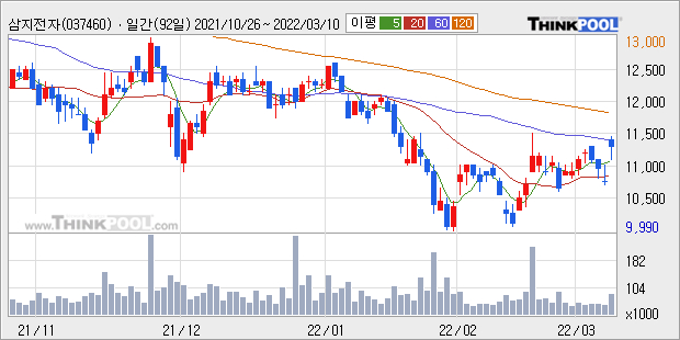 추세선으로 보면 단기간에 골든크로스를 만들고 주가가 60일선까지 뚫고 가는 모습이다. 최근 이 종목의 차트에서 주가 5MA 상향돌파, 캔들패턴(상승반전형), 최근 5일 매물대 돌파 등의 특이사항이 발생했다.