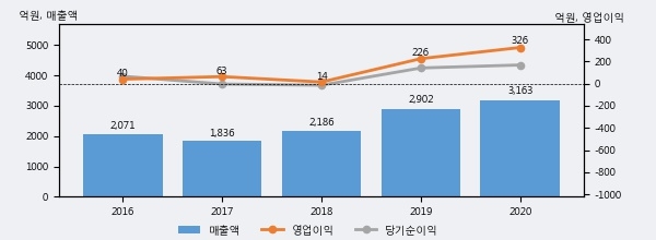 최근 3년간의 실적을 살펴보면 안정적 성장세를 보이고 있다. 최근 3년간 매출로 볼 때 매년 증가하고 있다. 다만 최근에 그 증가폭이 다소 감소하고 있다.