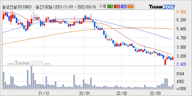 일성건설의 2020년 매출액은 3410억으로 전년대비 -9.3% 하락했고, 영업이익은 103억으로 전년대비 38.9% 상승했다. 이 회사의 매출액 증감률과 영업이익 증감률은 각각 코스피 하위 33%, 상위 30%에 해당된다.