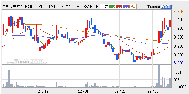 고려시멘트의 2020년 매출액은 전년대비 -1.0% 줄어든 702억원이고, 영업이익은 흑자전환해서 43억원을 기록했다. 이 회사의 매출액 증감률과 영업이익 증감률은 각각 코스닥 하위 47%, 상위 2%에 해당된다.