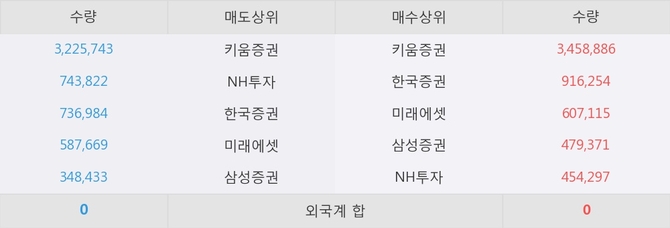 아직까지 외국계 증권사 창구를 통한 매매는 발생하지 않고 있다. 그리고 이 시간 한국증권이 매수창구상위에 올라있는 종목은 이 종목 이외에도 중앙디앤엠, 미래에셋 레버리지 원유선물혼합 ETN(H) 등이 있다.
