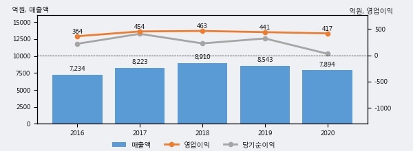 디와이는 2020년 매출액 7894억원과 영업이익 417억원을 기록했다. 전년대비 매출은 -7.6%, 영업이익은 -5.4% 각각 하락했다. 이 회사의 매출액 증감률과 영업이익 증감률은 각각 코스피 하위 37%, 하위 44%에 해당된다.