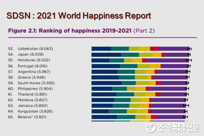 2019년부터 2021년까지 한국의 행복지수는 5.935점으로 60위인 필리핀(5.904)이나 61위 태국(5.891)보다는 높았지만, 57위 아르헨티나(5.967)나 58위 그리스(5.948)보다는 낮았다.