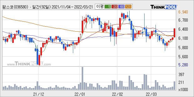 일봉 차트의 모습은 단기·중기 역배열 구간에서 60일선까지 뚫으며 상승 흐름을 보여주고 있다. 최근 이 종목의 차트에서 일목균형표 선행스팬 상향돌파(매수), 최근 60일 매물대 돌파 등의 특이사항이 발생했다.
