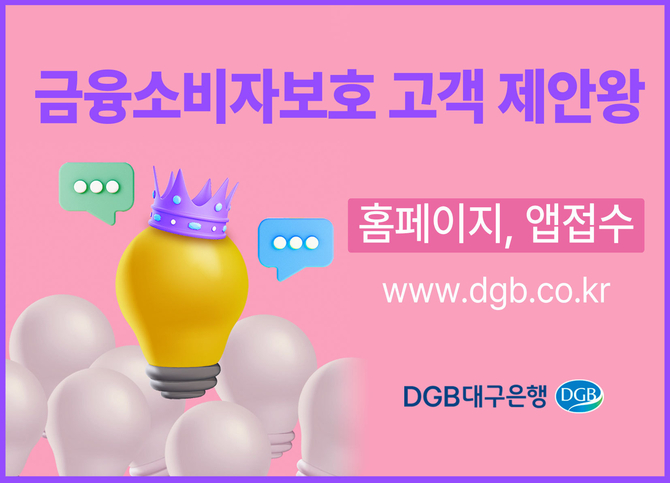 (조세금융신문=구재회기자) DGB대구은행은 금융소비자에게 소통과 참여의 기회를 제공하여 은행 제도와 관행개선에 필요한 아이디어를 접수 받는 ‘고객 제안왕 ’ 시즌2를 실시한다고 밝혔다.