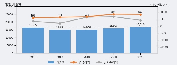 최근 실적을 살펴보면 2020년 매출액이 최근 5년 중 가장 높은 실적을 기록했음을 알 수 있다. 이전 최고 실적이었던 2016년 보다도 2.4%(394억 8천만원) 늘어난 것으로 나타났다.