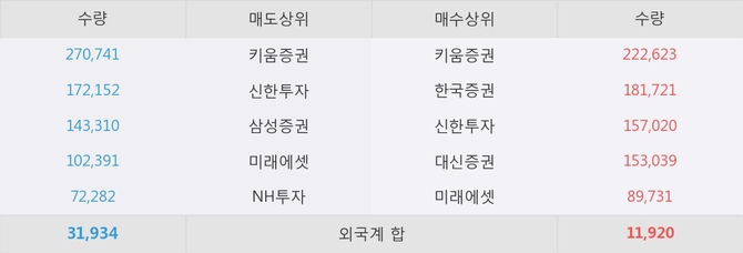 이 시각 주요 거래원은 미래에셋, 키움증권, 한국증권 등이 매수 상위 창구에 자리하고 있다.