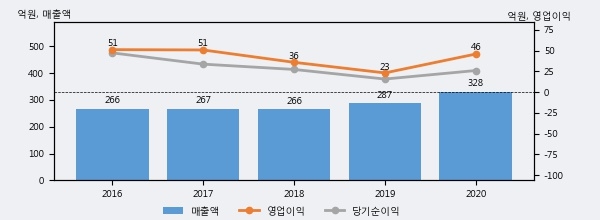 최근 실적을 살펴보면 2020년 매출액이 최근 5년 중 가장 높은 실적을 기록했음을 알 수 있다. 이전 최고 실적이었던 2019년 보다도 14.4%(41억 2천만원) 늘어난 것으로 나타났다.
