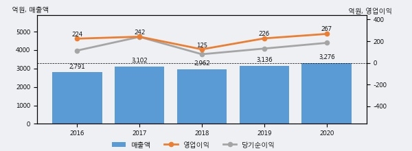 최근 실적을 살펴보면 2020년 매출액이 최근 5년 중 가장 높은 실적을 기록했음을 알 수 있다. 이전 최고 실적이었던 2019년 보다도 4.5%(140억 2천만원) 늘어난 것으로 나타났다.