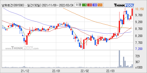 남화토건의 2020년 매출액은 전년대비 40.3% 늘어난 754억원이고, 영업이익 또한 전년대비 173.2% 늘어난 46억원을 기록했다. 이 회사의 매출액 증감률과 영업이익 증감률은 각각 코스닥 상위 11%, 상위 11%에 해당된다.