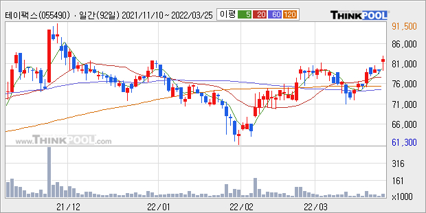 테이팩스는 2020년 매출액 1188억원과 영업이익 138억원을 기록했다. 전년대비 매출은 5.5%, 영업이익은 67.1% 각각 상승했다. 이 회사의 매출액 증감률과 영업이익 증감률은 각각 코스피 상위 26%, 상위 21%에 해당된다.
