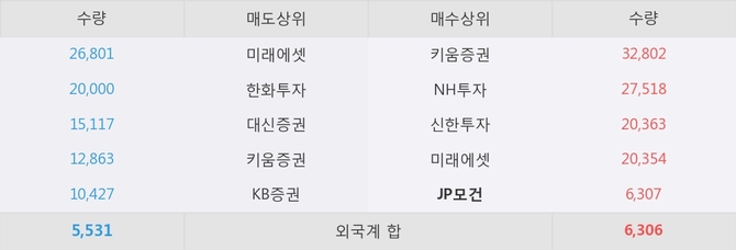 거래원 동향은 JP모건, NH투자, 미래에셋 등이 매수 상위 목록에 나타나고 있다.