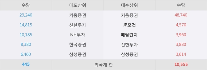거래원 동향은 JP모건, 메릴린치, 삼성증권 등이 매수 상위 목록에 위치하고 있다.
