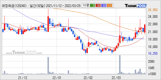 대정화금의 2020년 매출액은 802억으로 전년대비 0.7% 상승했고, 영업이익은 101억으로 전년대비 -2.3% 하락했다. 이 회사의 매출액 증감률과 영업이익 증감률은 각각 코스닥 상위 49%, 하위 48%에 해당된다.