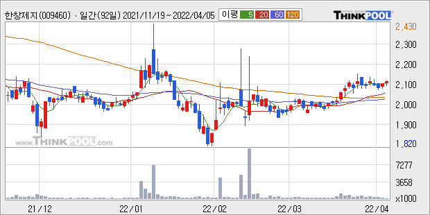 한창제지는 2021년 매출액 1822억원과 영업이익 178억원을 기록했다. 전년대비 매출은 6.3%, 영업이익은 3.0% 각각 상승했다. 이 회사의 매출액 증감률과 영업이익 증감률은 각각 코스피 하위 32%, 하위 40%에 해당된다.