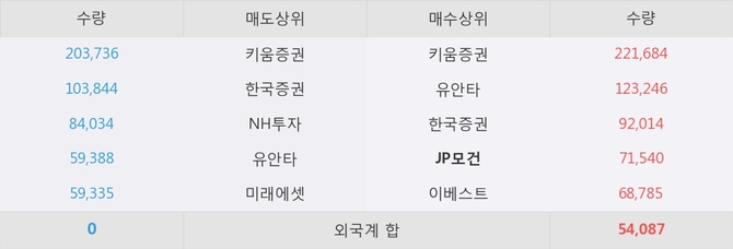 JP모건이 매수상위 창구 4위를 기록중이고, 그 외에 키움증권, 유안타 등이 매수 창구 상위에 위치하고 있다.