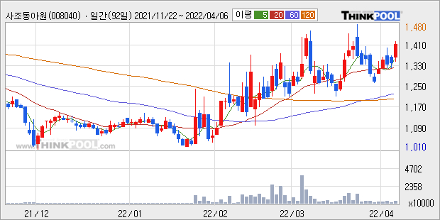 사조동아원의 2021년 매출액은 4121억으로 전년대비 4.0% 상승했고, 영업이익 또한 191억으로 전년대비 14.8% 상승했다. 이 회사의 매출액 증감률과 영업이익 증감률은 각각 코스피 하위 29%, 하위 47%에 해당된다.