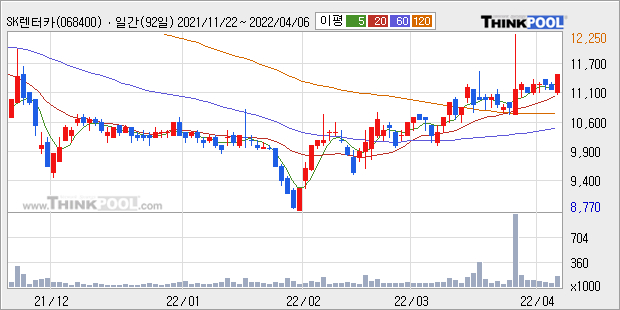 SK렌터카의 2021년 매출액은 1조 369억으로 전년대비 20.1% 상승했고, 영업이익 또한 790억으로 전년대비 11.7% 상승했다. 이 회사의 매출액 증감률과 영업이익 증감률은 각각 코스피 상위 35%, 하위 45%에 해당된다.