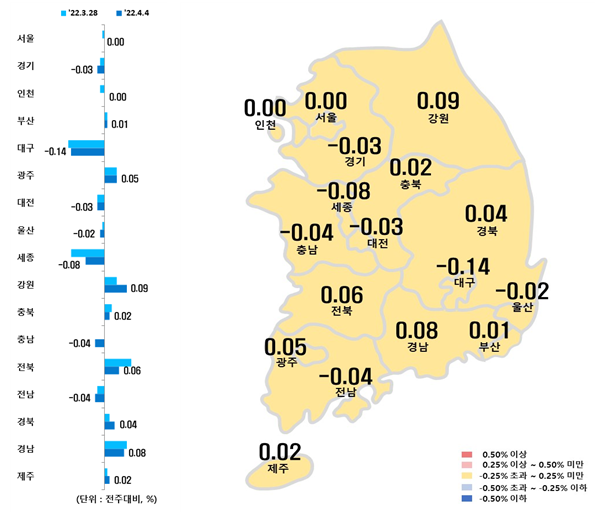 이천시(0.32%)는 저가 인식 잇는 외곽 지역 위주로 상승했지만 용인 수지구(-0.15%)·오산시(-0.14%)는 매물 적체 영향이 지속되며, 과천시(-0.13%)는 거래심리 위축 등 영향 있는 별양동 위주로 하락했다. 화성시(-0.12%)는 석우·산척동 주요 단지 위주로 하락세가 두드러졌다.