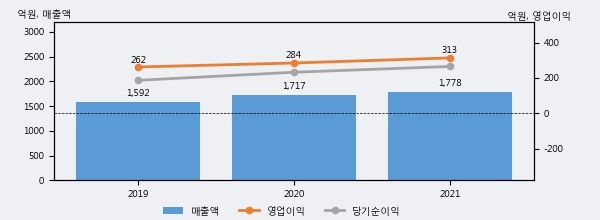 최근 실적을 살펴보면 2021년 매출액이 최근 3년 중 가장 높은 실적을 기록했음을 알 수 있다. 이전 최고 실적이었던 2020년 보다도 3.5%(60억 7천만원) 늘어난 것으로 나타났다.