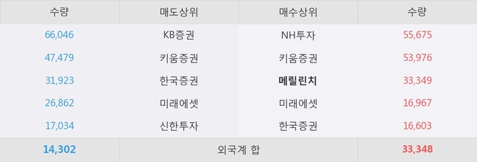 이 시각 주요 거래원은 미래에셋, KB증권, 키움증권 등이 매도 상위 창구에 자리하고 있다. 한편, 매수 창구 상위에는 메릴린치가 눈에 띄고 있다.