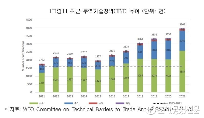12일 대한상공회의소는 최근 국제무역 환경 실태를 분석한 결과 지난해 세계무역기구(WTO)에 통보된 무역기술장벽 건수는 총 3,966건으로, 기존 최대치였던 2020년(3,352건)보다 18.3% 증가한 역대 최대치를 기록한 것으로 조사됐다고 발표했다.