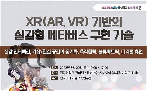 (조세금융신문=고승주 기자) 한국미래기술교육연구원(대표 박희정)은 대달 20일 서울 여의도 전경련회관 사파이어홀에서 ‘확장현실 기반의 실감형 메타버스 구현 기술’을 주제로 온, 오프라인 세미나를 개최한다.