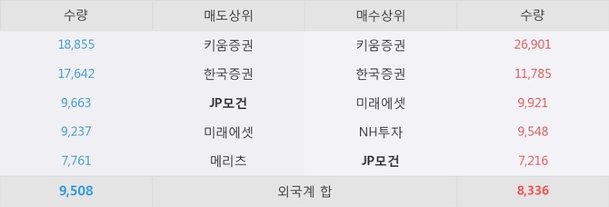 거래원 동향은 JP모건, 미래에셋, NH투자 등이 매수 상위 목록에 나타나고 있다. 한편, 매도 창구 상위에는 JP모건이 눈에 띄고 있다.