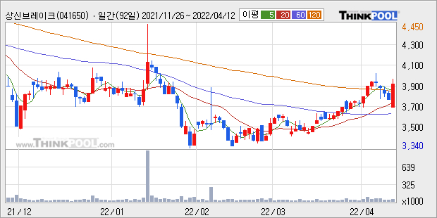 상신브레이크의 2021년 매출액은 전년대비 13.7% 늘어난 3970억원이고, 영업이익 또한 전년대비 55.2% 늘어난 122억원을 기록했다. 이 회사의 매출액 증감률과 영업이익 증감률은 각각 코스피 상위 49%, 상위 38%에 해당된다.
