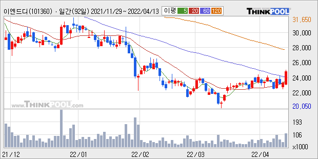 이엔드디는 2021년 매출액 774억원과 영업이익 79억원을 기록했다. 전년대비 매출은 -16.1%, 영업이익은 -51.8% 각각 하락했다. 이 회사의 매출액 증감률과 영업이익 증감률은 각각 코스닥 하위 1%, 하위 1%에 해당된다.