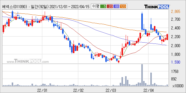 에넥스는 2021년 매출액 2018억원과 영업이익 -123억원을 기록했다. 전년대비 매출은 -13.7% 하락했고, 영업이익은 전년에 이어 적자가 지속됐다. 이 회사의 매출액 증감률과 영업이익 증감률은 각각 코스피 하위 6%, 하위 16%에 해당된다.