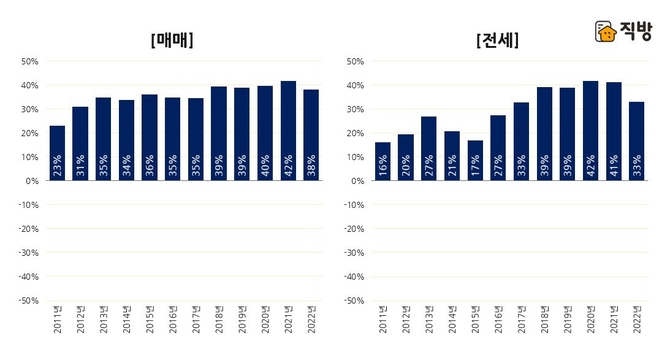 18일 직방이 2011년부터 2022년 4월 4일 실거래신고와 계약일 집계 기준 입주연차 5년~29년된(일반) 아파트의 매매 전세 거래건수를 분석한 결과 지은지 30년이 넘은 구축아파트의 경우 올해 매매시장에서 일반 아파트보다 4% 가량 높은 가격을 형성했다.