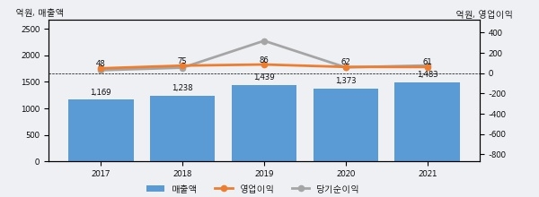 최근 실적을 살펴보면 2021년 매출액이 최근 5년 중 가장 높은 실적을 기록했음을 알 수 있다. 이전 최고 실적이었던 2019년 보다도 3.0%(43억 5천만원) 늘어난 것으로 나타났다.