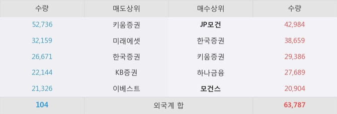거래원 동향은 JP모건, 모건스, 하나금융 등이 매수 상위 목록에 위치하고 있다.
