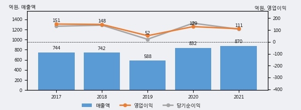 최근 실적을 살펴보면 2021년 매출액이 최근 5년 중 가장 높은 실적을 기록했음을 알 수 있다. 이전 최고 실적이었던 2020년 보다도 4.6%(38억 6천만원) 늘어난 것으로 나타났다.