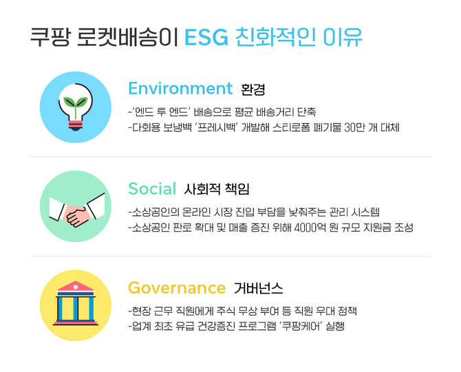 직매입 방식인 로켓배송 덕분에 소상공인의 시장 진입 부담이 줄고, 대형 업체와 대등하게 상품력으로 경쟁할 수 있는 기회를 갖게 된 것이 대표적이다. 회사의 사업구조 자체가 ESG에 부합한다는 색다른 관점의 분석이어서 유통업계의 주목을 받고 있다.
