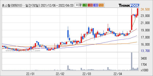 휴스틸은 2021년 매출액 6165억원과 영업이익 632억원을 기록했다. 전년대비 매출은 68.6%, 영업이익은 257.9% 각각 상승했다. 이 회사의 매출액 증감률과 영업이익 증감률은 각각 코스피 상위 5%, 상위 13%에 해당된다.