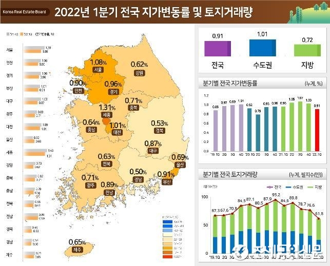 22일 국토교통부와 한국부동산원은 올해 1분기 전국 땅값 상승률이 0.91%를 기록해 전분기(1.03%) 대비 0.12%포인트(p), 작년 1분기(0.96%)와 비교해서는 0.05%p 각각 낮아졌다고 발표했다.