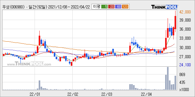 우성은 2021년 매출액 4805억원과 영업이익 9억원을 기록했다. 전년대비 매출은 23.7% 상승했고, 영업이익은 -79.8% 하락했다. 이 회사의 매출액 증감률과 영업이익 증감률은 각각 코스피 상위 30%, 하위 11%에 해당된다.