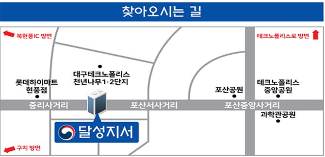 달성지서는 달성군 현풍읍 중리 테크노폴리스 소재 M큐브빌딩(2층)에 위치하며, 공공업무시설로써의 안정성과 사용자 편의성을 최대한 고려해 내·외부 리모델링 공사를 거쳤다.