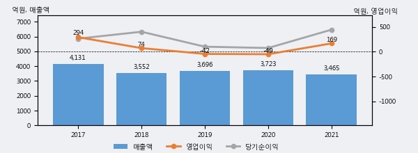 신라교역의 2021년 매출액은 전년대비 -6.9% 줄어든 3465억원이고, 영업이익은 흑자전환해서 169억원을 기록했다. 이 회사의 매출액 증감률과 영업이익 증감률은 각각 코스피 하위 11%, 상위 9%에 해당된다.