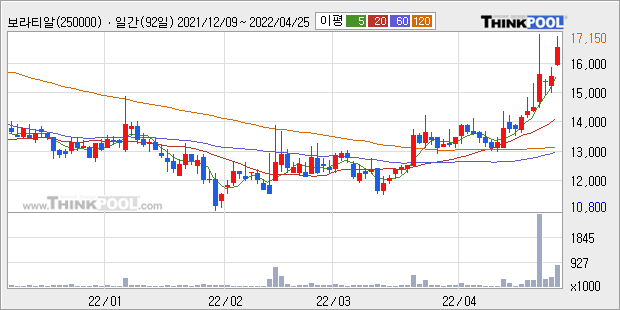 차트상 주가의 흐름은 현재 단기·중기 이평선이 정배열 상태로 전형적인 상승세를 보이고 있다. 이 종목의 차트에서 최근에 최근 5일 매물대 돌파, 최근 60일 매물대 돌파 등을 확인할 수 있다