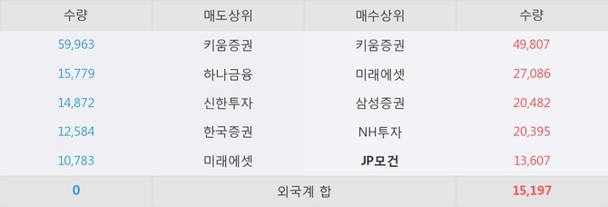 거래원 동향은 하나금융, 미래에셋 등이 매도 상위 목록에 나타나고 있다. 한편, 매수 창구 상위에는 JP모건이 눈에 띄고 있다.
