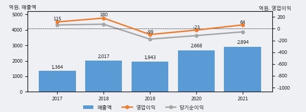 최근 실적을 살펴보면 2021년 매출액이 최근 5년 중 가장 높은 실적을 기록했음을 알 수 있다. 이전 최고 실적이었던 2020년 보다도 8.5%(225억 6천만원) 늘어난 것으로 나타났다.